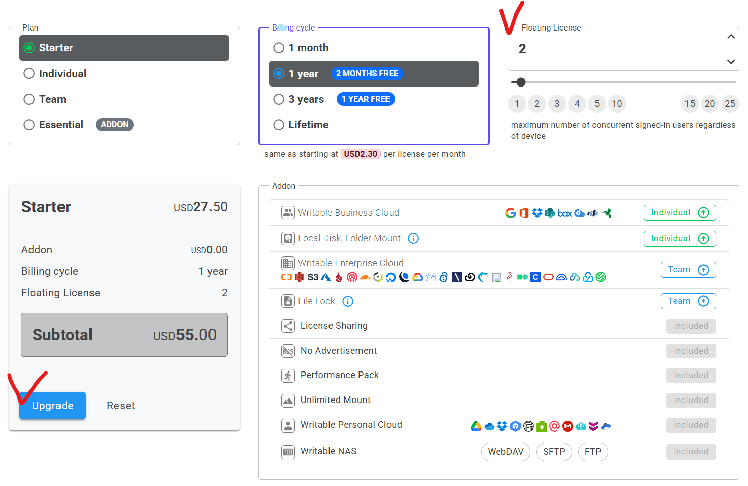 Adjust the number of Floating License to your desired number and click the Upgrade button in the bottom left corner to proceed.